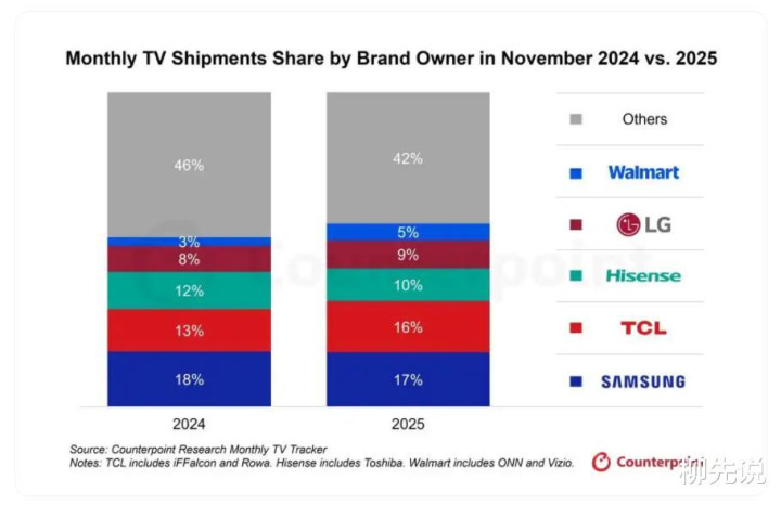 据市场调研机构Counterpoint公布的报告来看,去年11月份全球前五名的厂商分别为三星、TCL、海信、LG以及沃尔玛。这一排名结果清晰地展现了当前全球电视市场的竞争格局,头部品牌的市场主导地位进一步巩固,同时也出现了新的竞争变量。排名第5的沃尔玛,市占率5%,收购了Vizio后迅速扩大出货量,其电视销量主要来自北美市场。